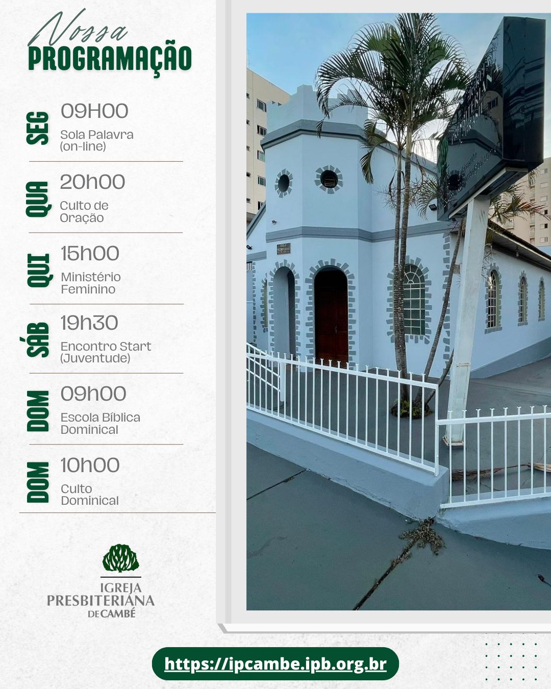 - 09:00 horas - Escola Bíblica Dominical;