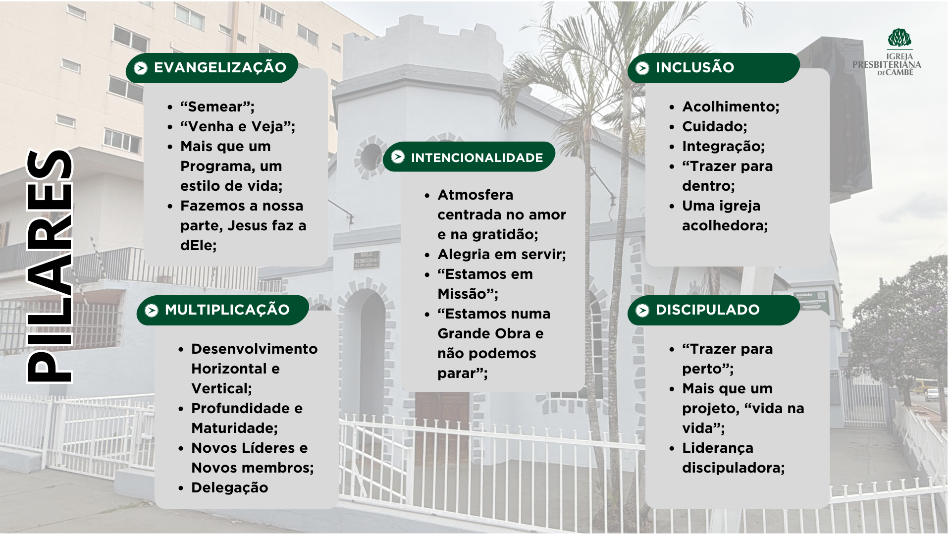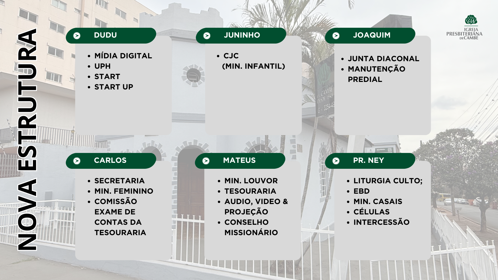 Após as reuniões com o Conselho, com a Liderança da Igreja e em nossa última Assembléia Ordinária, divulgamos a nova estrutura de apoio de nossa igreja.